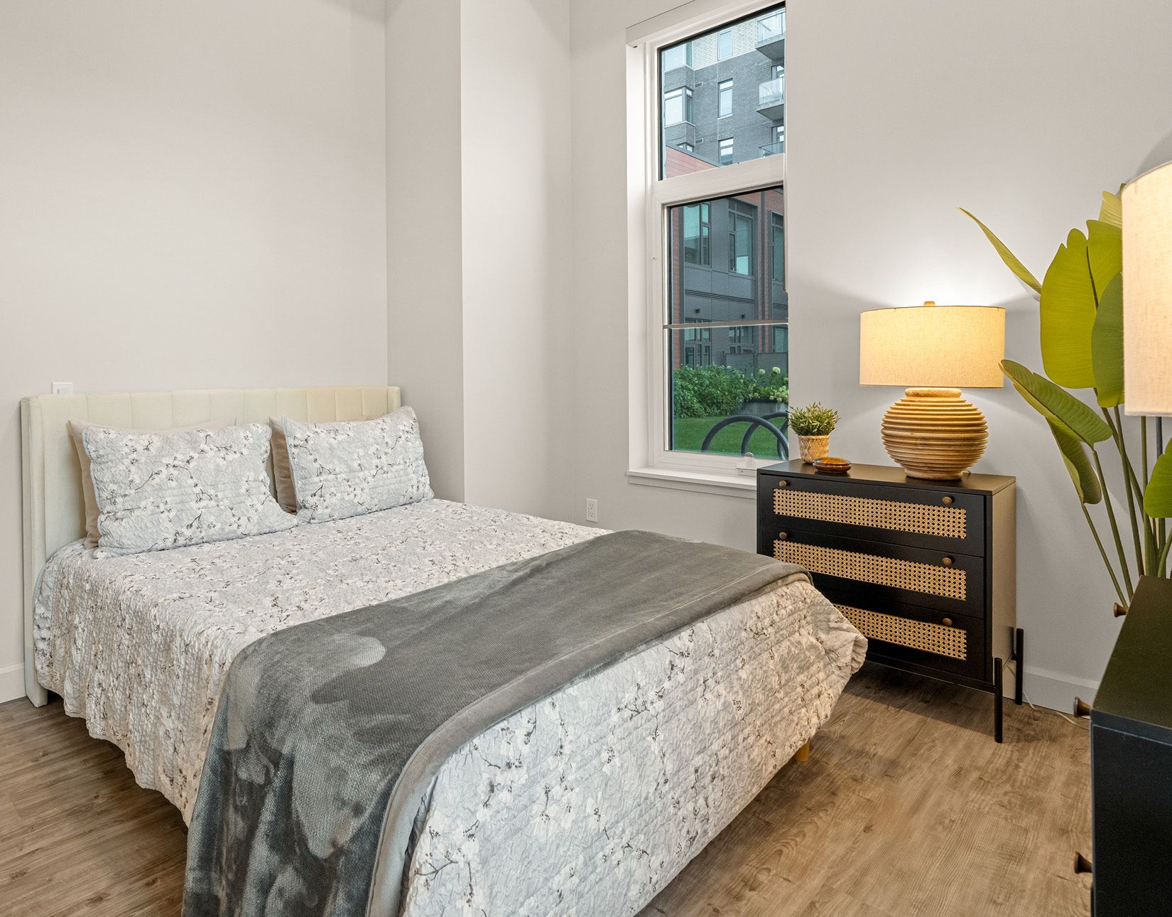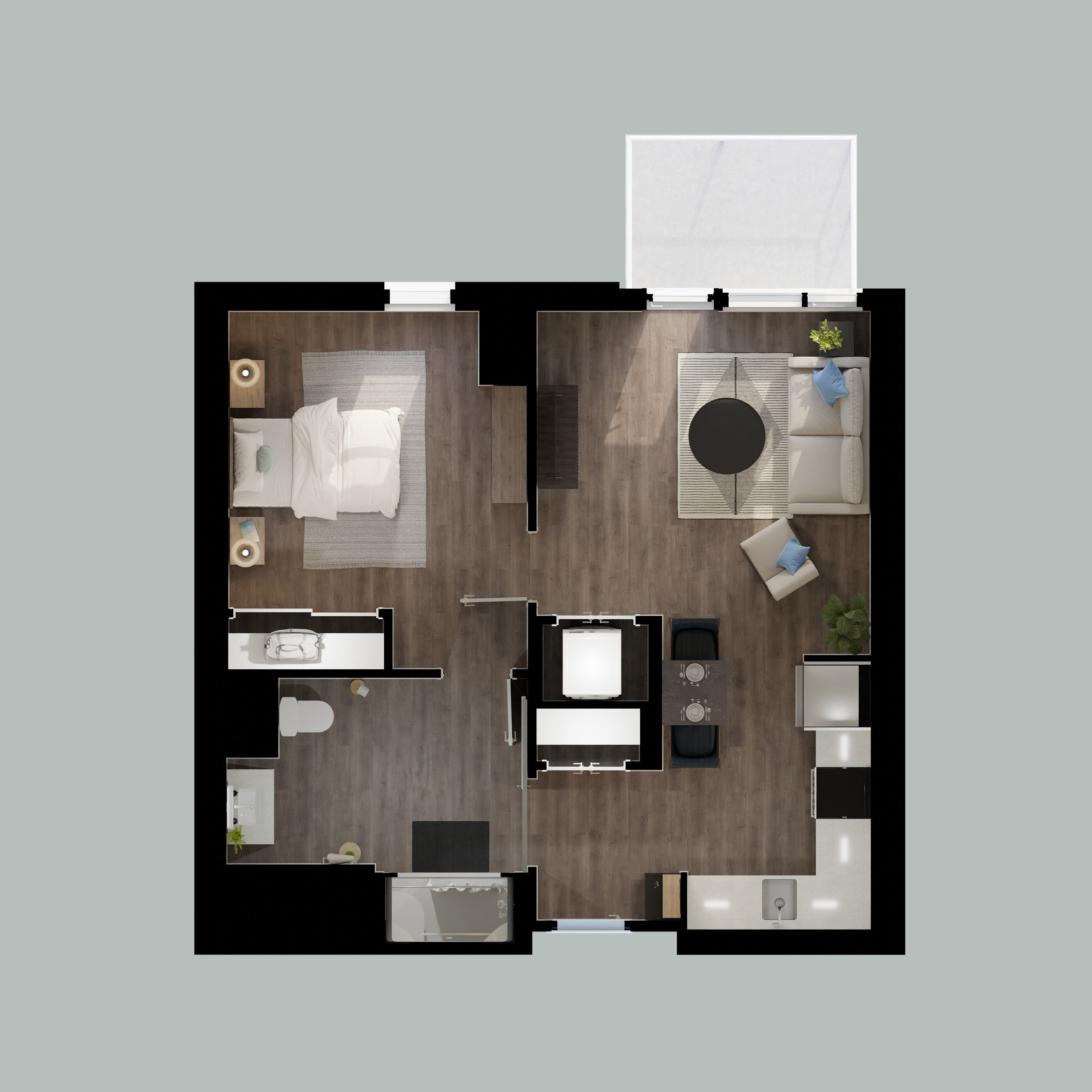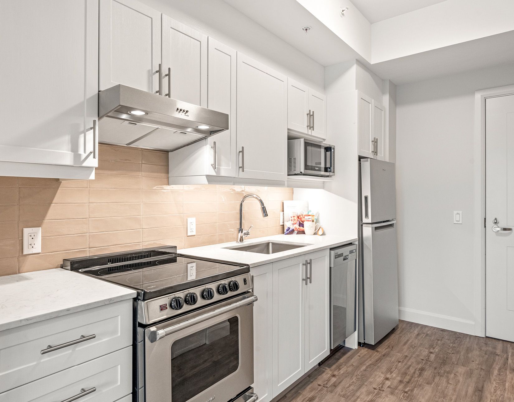Enjoy the freedom of independent living in one of our expansive one-bedroom units, offering 516+ sq ft and a balcony. Our full kitchens come with modern appliances, while the bathrooms feature walk-in showers with built-in seat, anti-slip flooring, and grab bars. Soft-close cabinetry, abundant natural light from large windows, and an in-unit washer and dryer complete our comfortable one bedroom apartments.