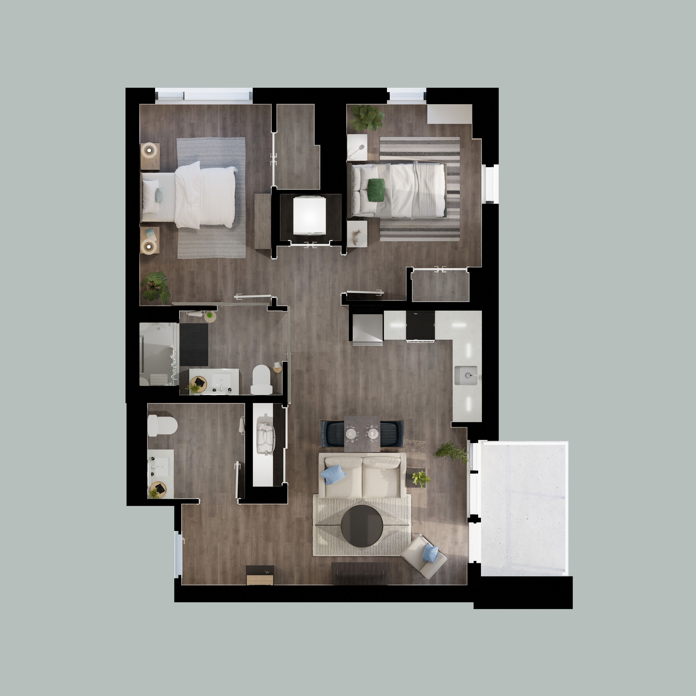 Perfect for those seeking extra space, our two bedroom units span 820+ sq ft and include a balcony for outdoor relaxation. Our full kitchens are equipped with a fridge, stove, microwave, and dishwasher. Safety and comfort are prioritized with a walk-in shower with a built-in seat, anti-slip flooring, and grab bars. Soft-close cabinets, generous windows, and an in-suite washer and dryer provide everything needed for independent living.