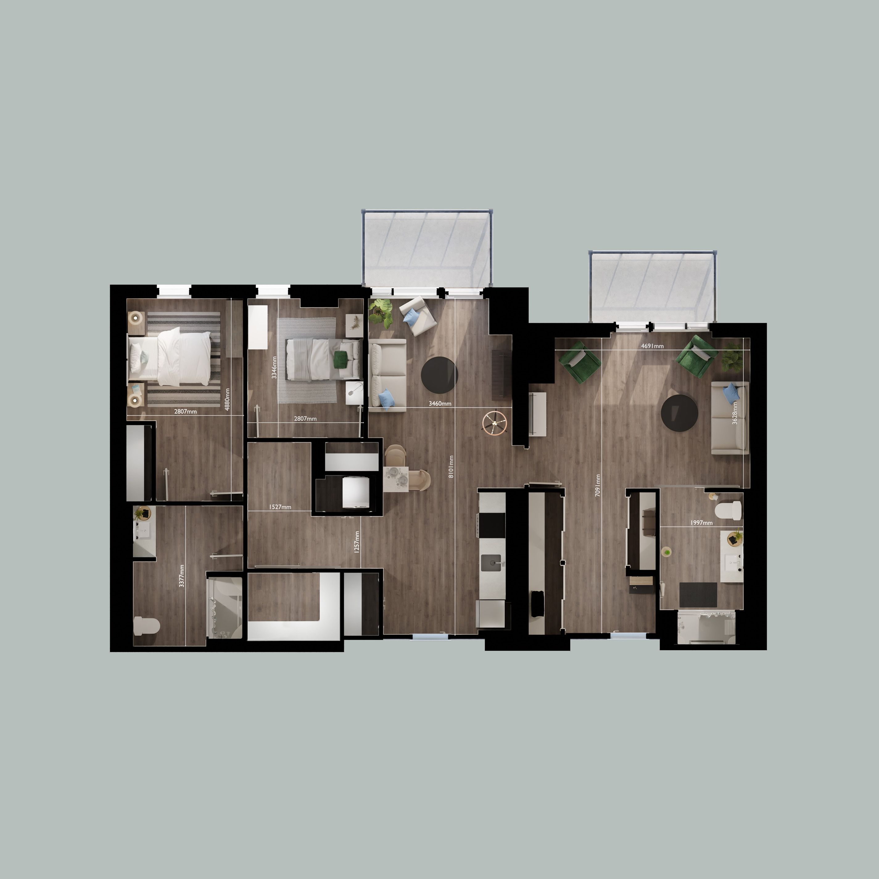 Our three bedroom unit offers ample space inside and out, with flexible living areas and two balconies. The full kitchen features a fridge, stove, microwave, and dishwasher. The bathroom is equipped with a walk-in shower with built-in seat, anti-slip flooring, and grab bars for peace of mind. Soft-close cabinets, large windows, and the added convenience of an in-suite washer and dryer complete our three bedroom unit.