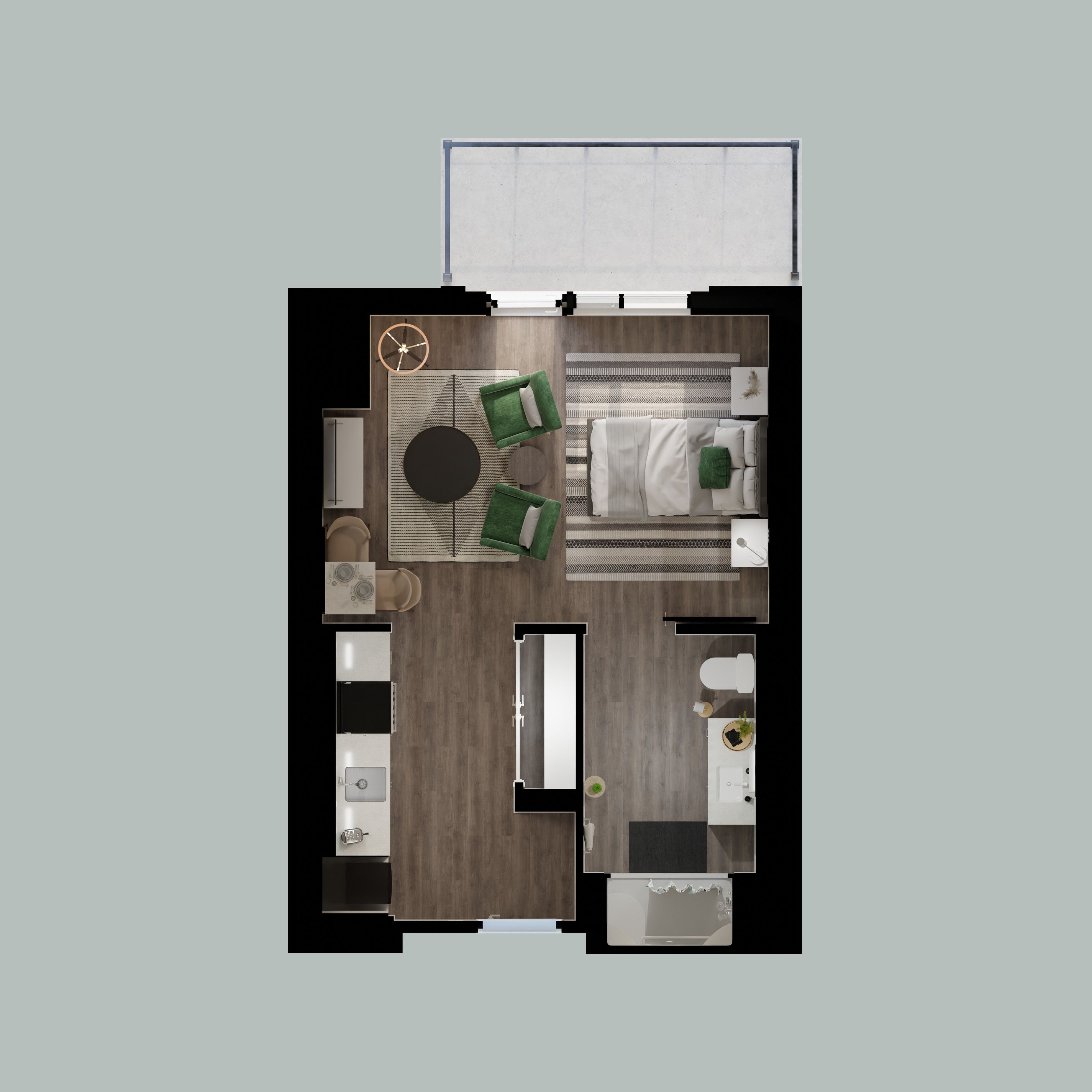 Our open-concept studios provide 450+ sq ft of independent living space, complete with a full kitchen featuring a fridge, stove, microwave, and dishwasher. Bathrooms are equipped with a walk-in shower with built-in seat, anti-slip flooring, and grab bars for peace of mind. Soft-close cabinets, large windows, and the added convenience of an in-suite washer and dryer make our studio units both practical and inviting.